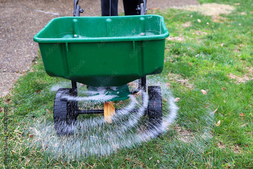 Fotografie A seed and fertilizer spreader sitting out on a lawn