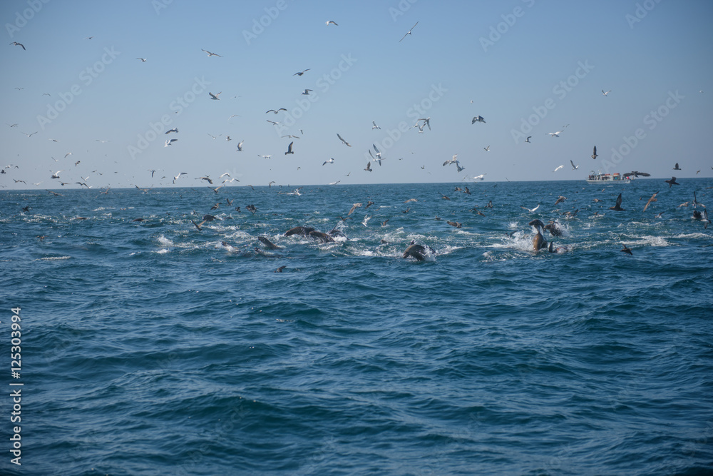 Autocolant Sealions, dolphins, Brown Pelicans in feeding frenzy