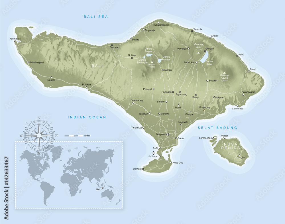 Autocolant Karte von Bali, Indonesien (modifizierbar)