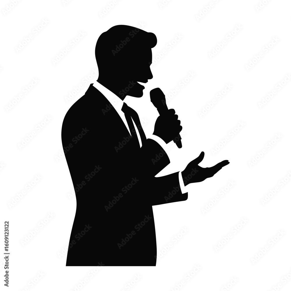 Autocolant Silhouette of a confident man speaking into a microphone with an open hand gestu