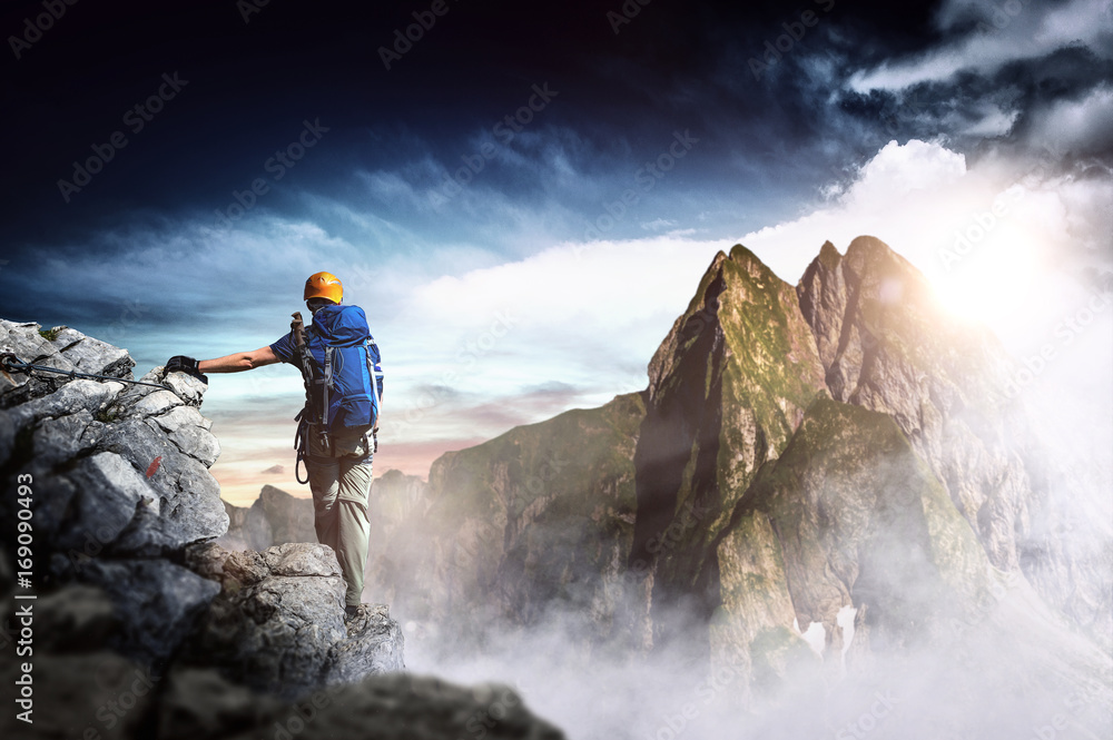 Autocolant Bergsteiger erreicht den Gipfel eines Berges. Panorama.