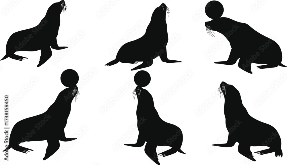 Autocolant Silhouette collection of playful sea lions balancing balls, circus marine animal