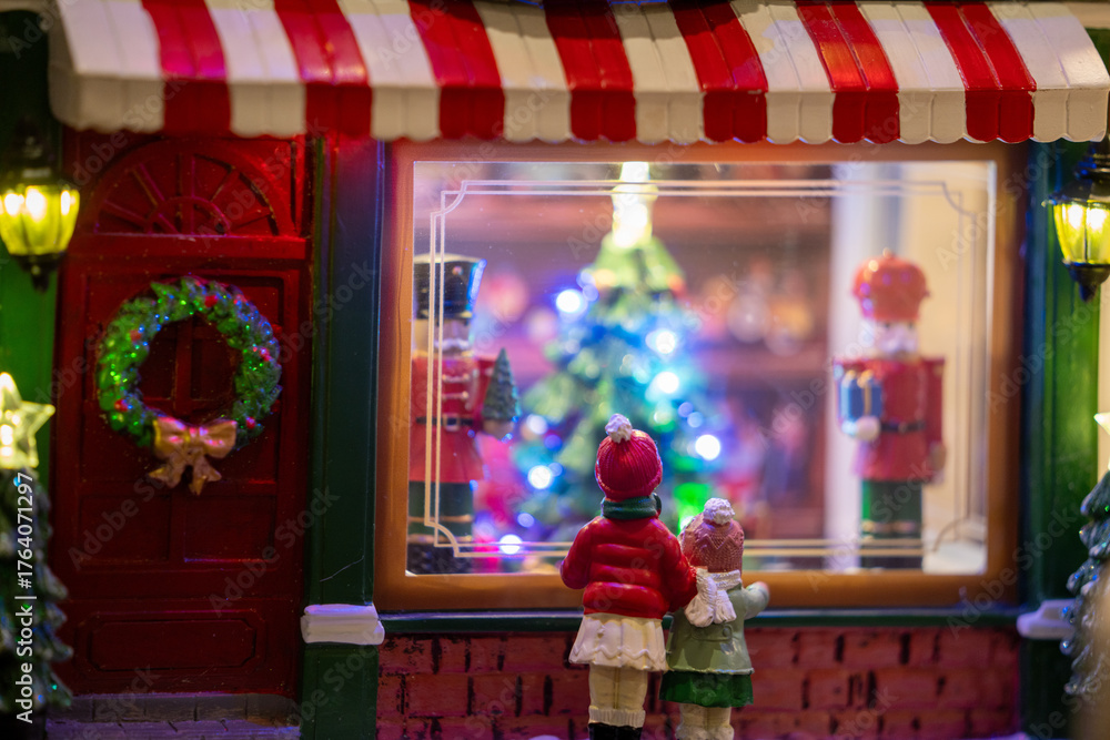 Autocolant Children admire a Christmas display with a decorated tree and nutcracker figures