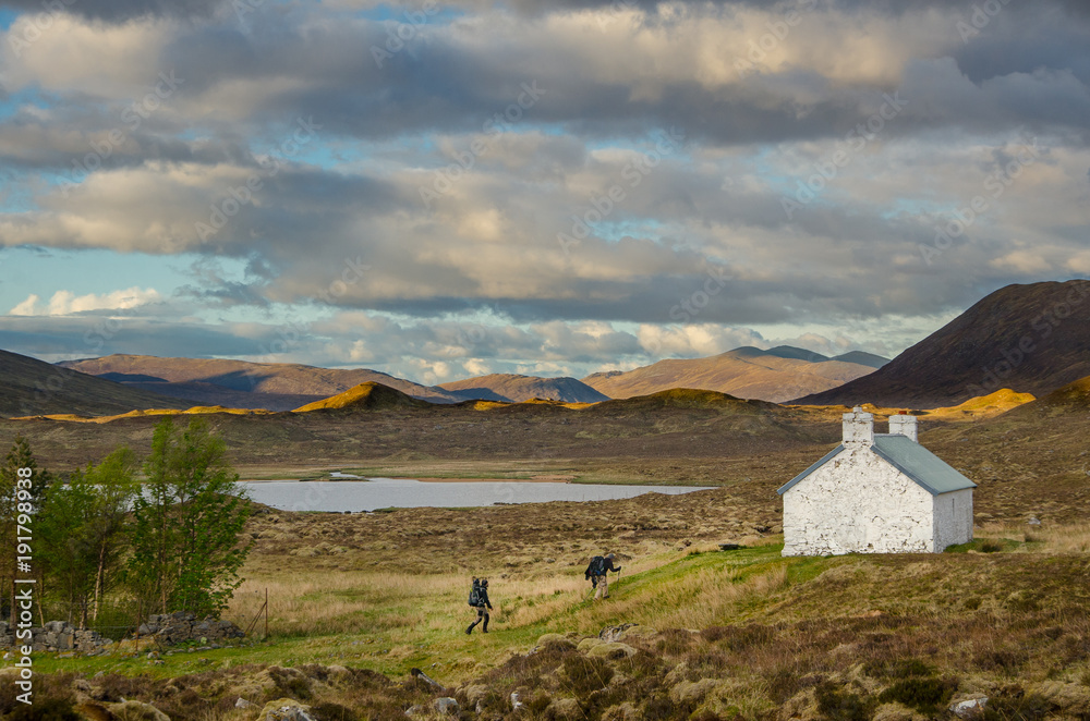 Autocolant SCOTLAND, UNITED KINGDOM - MAY, 2017 : Trekker hiking on the Cape Wrath Trail in Scotland