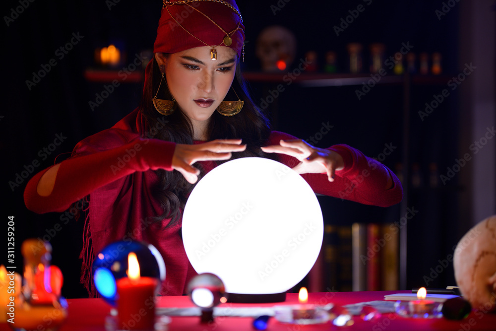 Autocolant Fortune-teller woman is predicting with a shining crystal ball