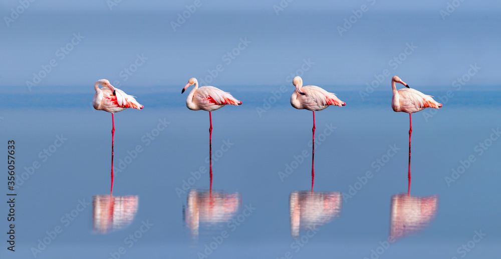 Autocolant Group birds of pink african flamingos walking around the blue lagoon on a sunny