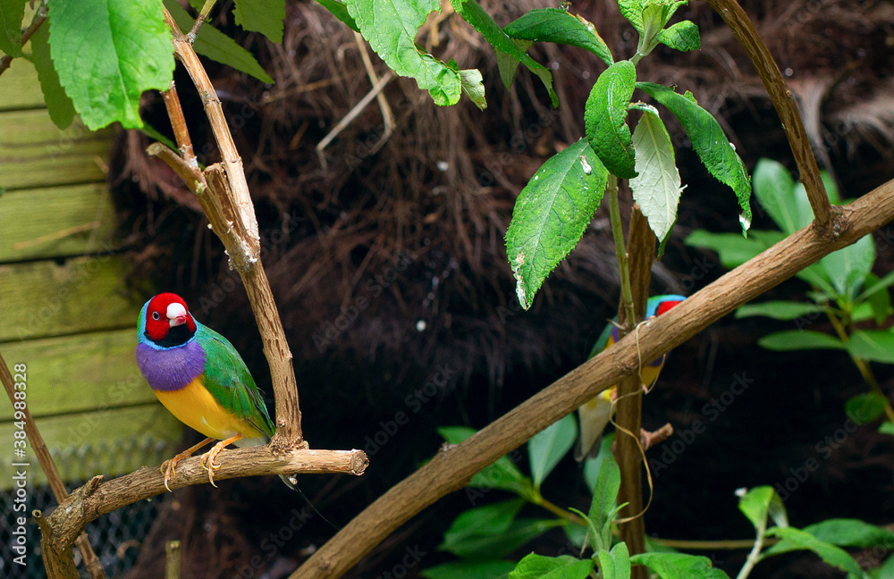 Autocolant Colorful Gould finches sit on a branch in a cage at the zoo