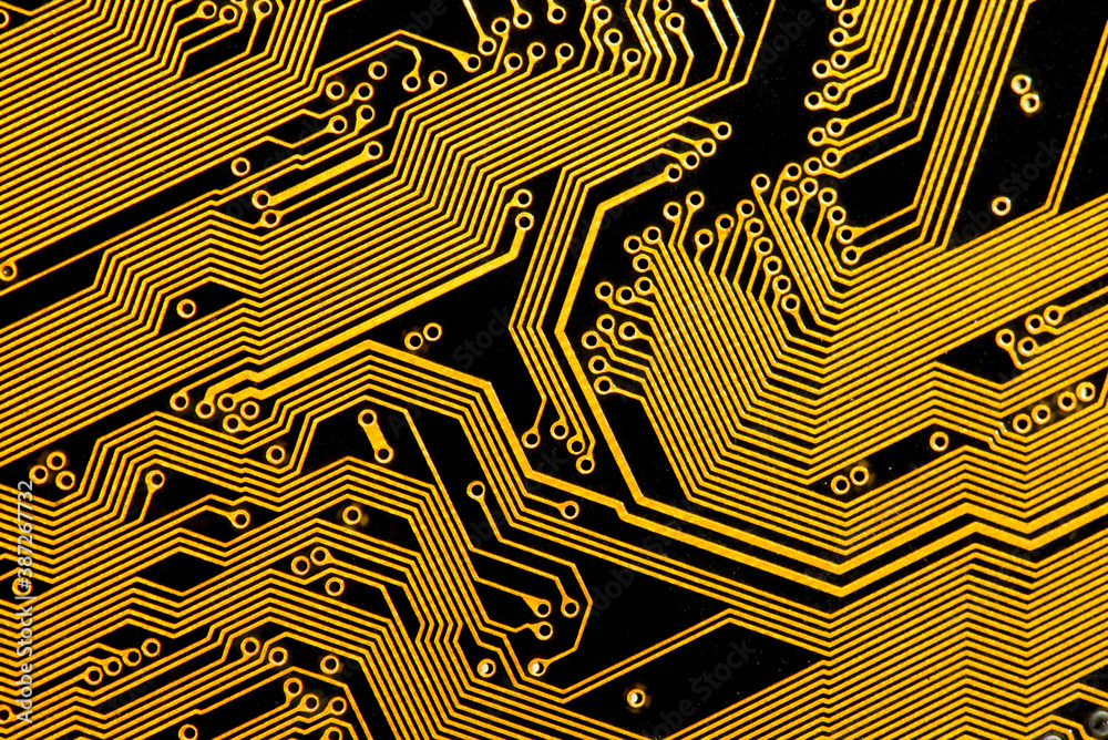 Autocolant Golden conductive tracks on a black circuit board, abstract background