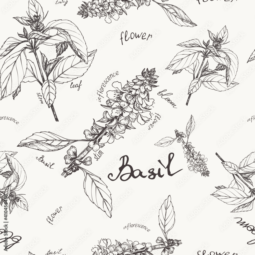 Autocolant Seamless pattern of sprigs and flowers of basil on a light background