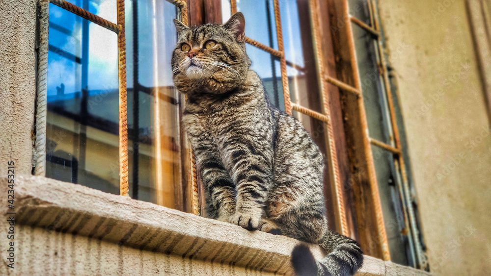 Autocolant A gorgeous british tabby cat is sitting dreamily on the windowsill