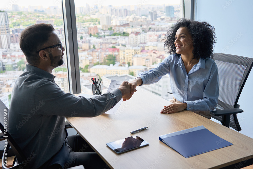 Autocolant Indian friendly ceo businessman hr director holding job contract hiring welcoming female African American applicant manager shaking hands in contemporary office