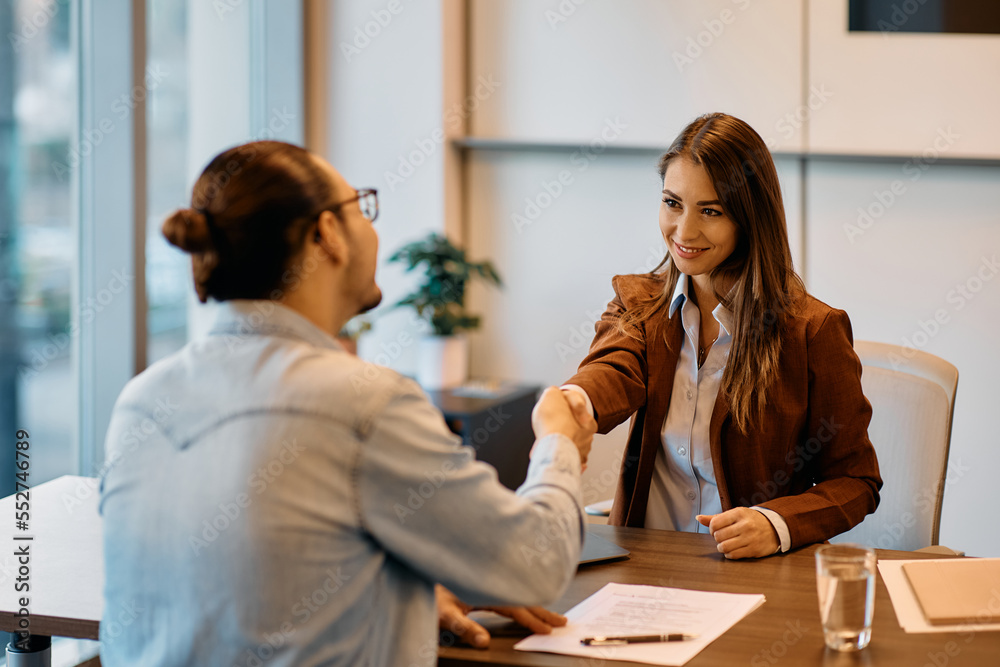 Autocolant Happy human resource manager handshaking with male candidate on job interview in office