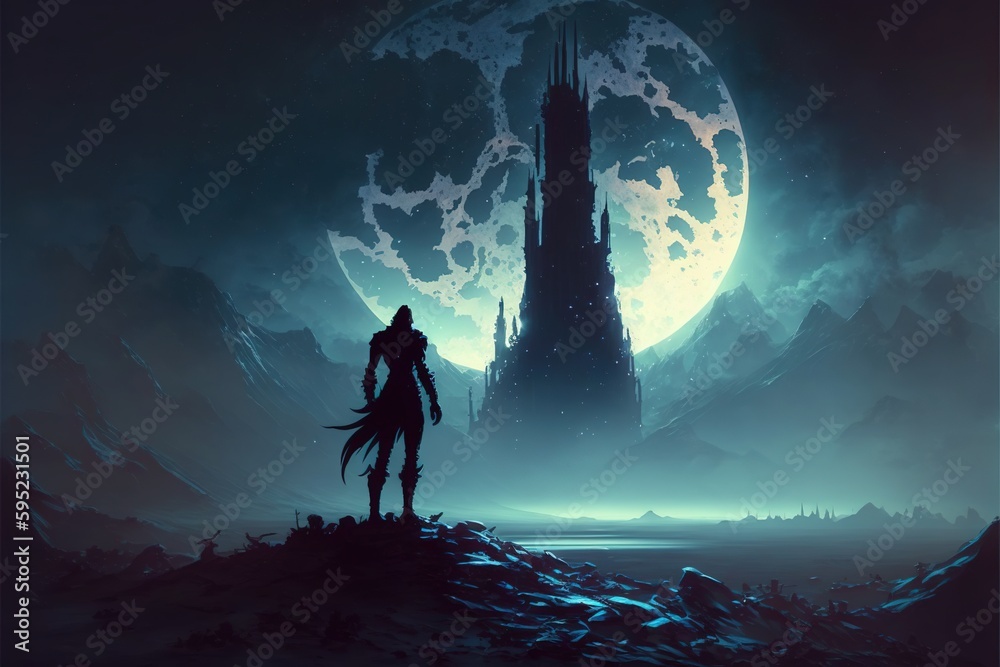 Autocolant A dark medieval fantasy landscape with a tall black Romanesque tower, silhouetted against the full moon