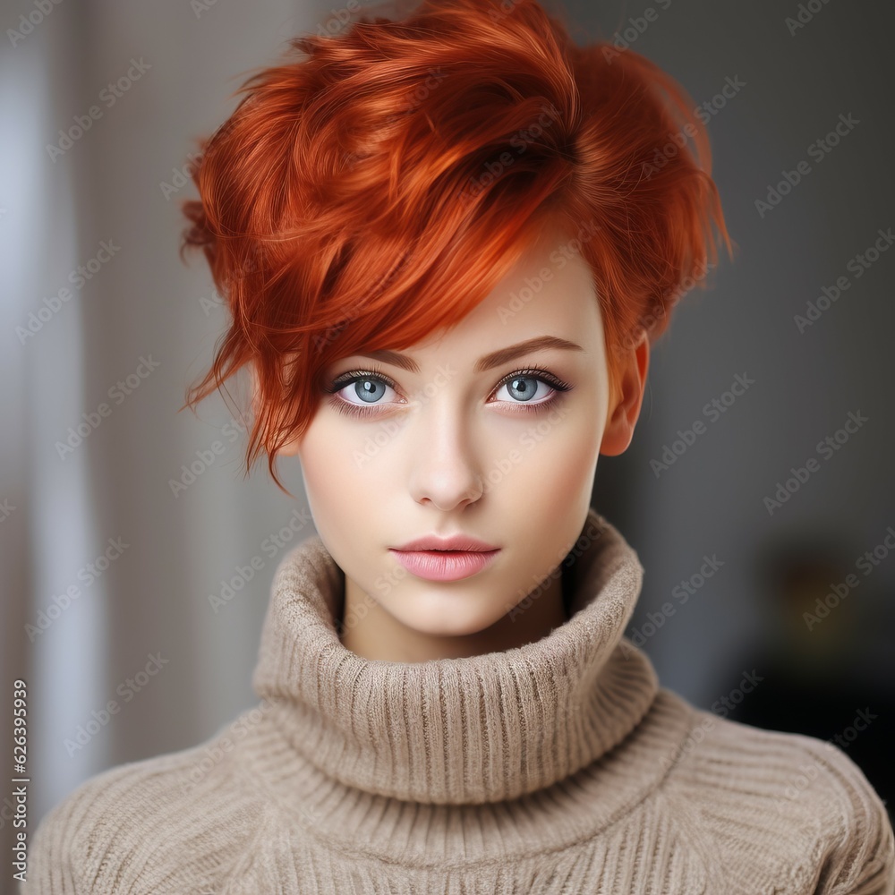 Autocolant Fashion portrait of beautiful young red-haired woman with short hairstyle and professional make up