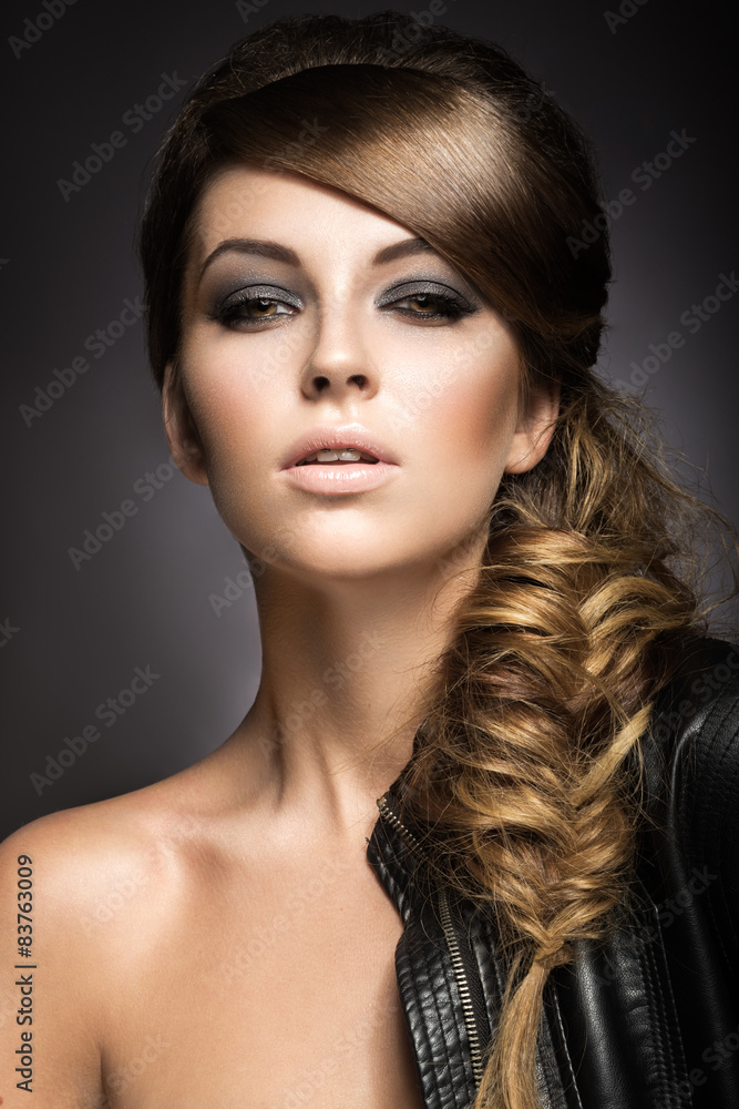 Autocolant Beautiful girl with bright make-up, perfect skin and hairstyle as a braid