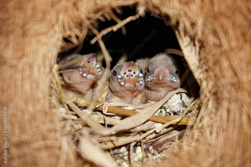 Tablou pe pânză Baby bird Finches waits for food from the mother finches