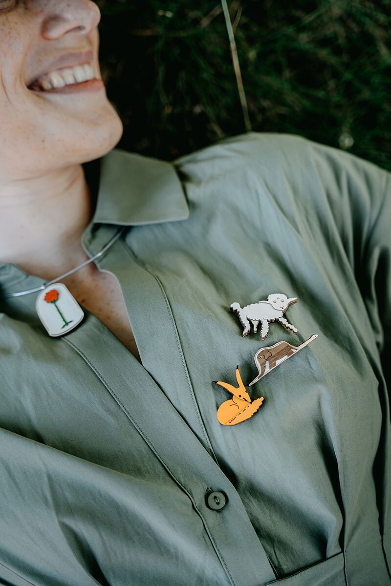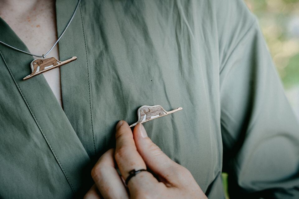 Broșă originală din lemn natural care adaugă personalitate oricărei ținute. Lucrătura precisă și materialele de calitate garantează că fiecare piesă este unică – în textură, formă și expresie.