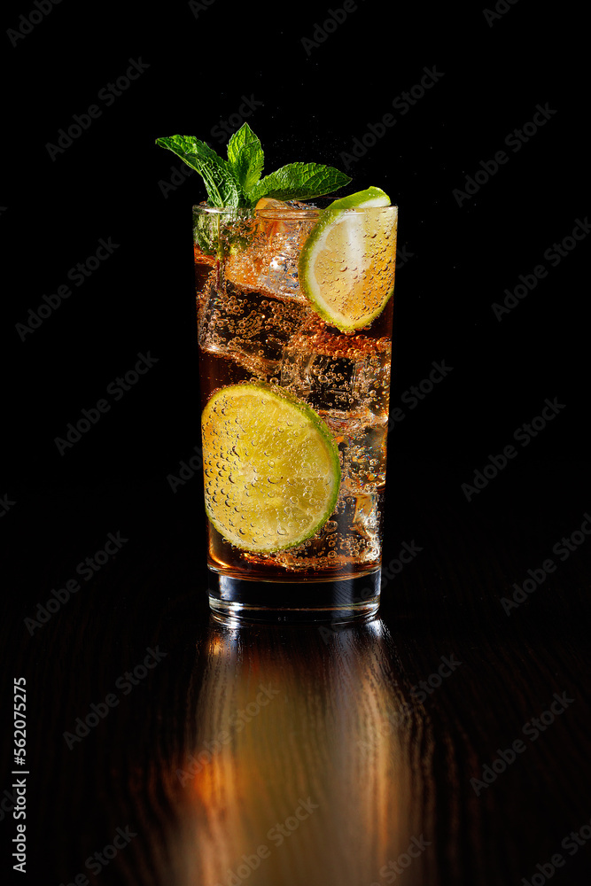 Fotografie Cold refreshing summer cocktail cuba libre or iced tea with lime