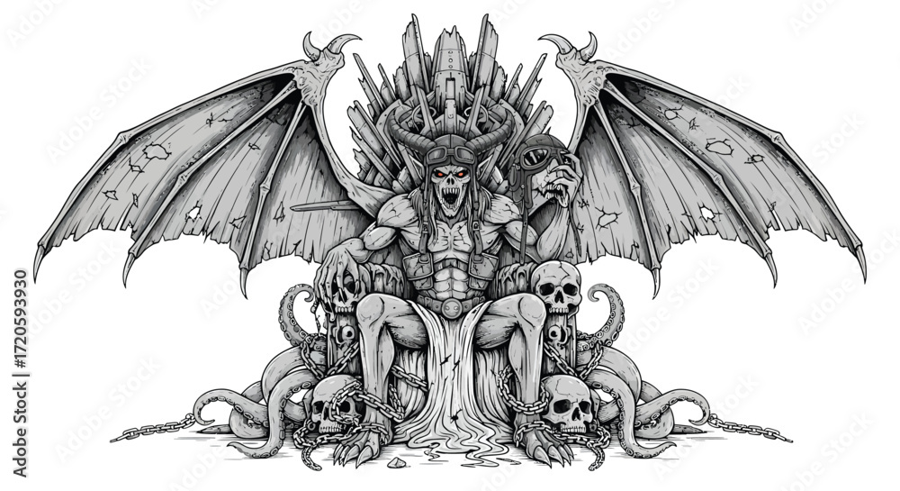Fotografie Demonic King on a Throne of Skulls with Damaged Wings and Tentacles