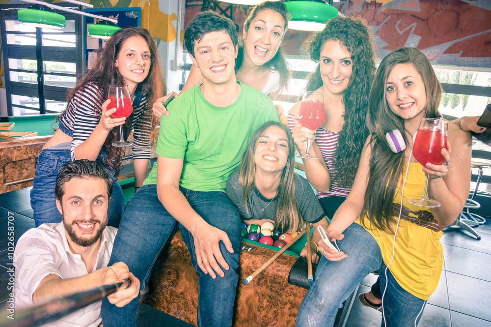 Fototapet Best friends taking selfie at billiard pool table with back lighting - Happy fri