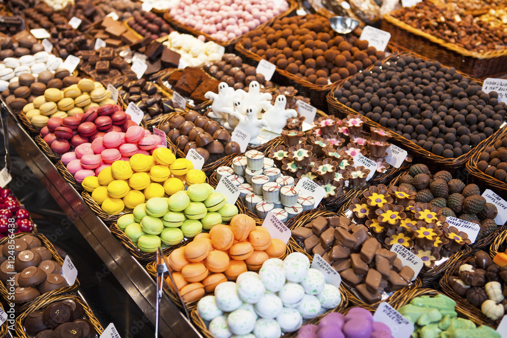 Fototapet Colourful sweets: macarons,chocolate in a La Boqueria Market, Barcelona, Catalonia