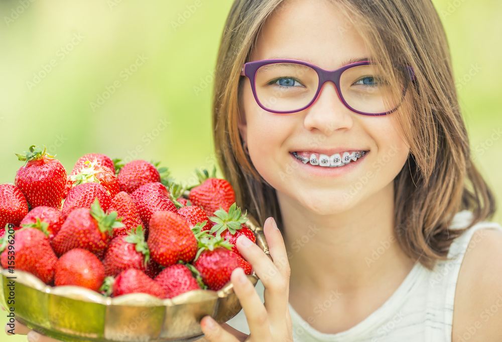 Fototapet Cute little girl with bowl full of fresh strawberries