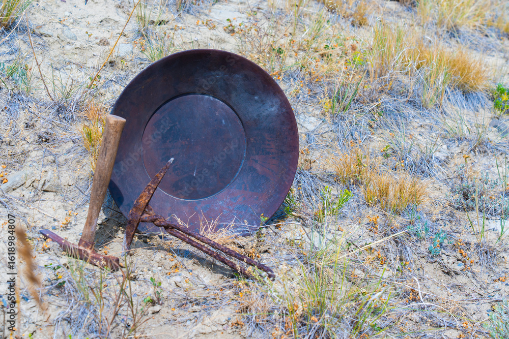 Fototapet Gold-pan & mining picks rest in desert showing landscape soil, mountain background