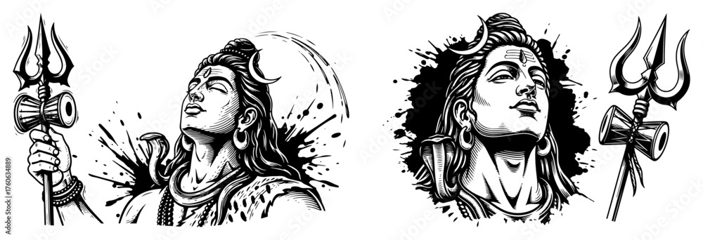 Fototapet Lord Shiva Portrait with Trident and Damaru Ink Splash Vector
