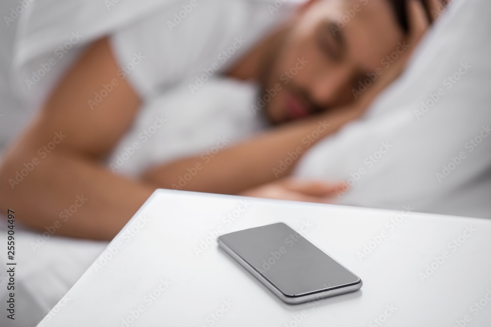 Fototapet technology and people concept - close up of smartphone on bedside table near you