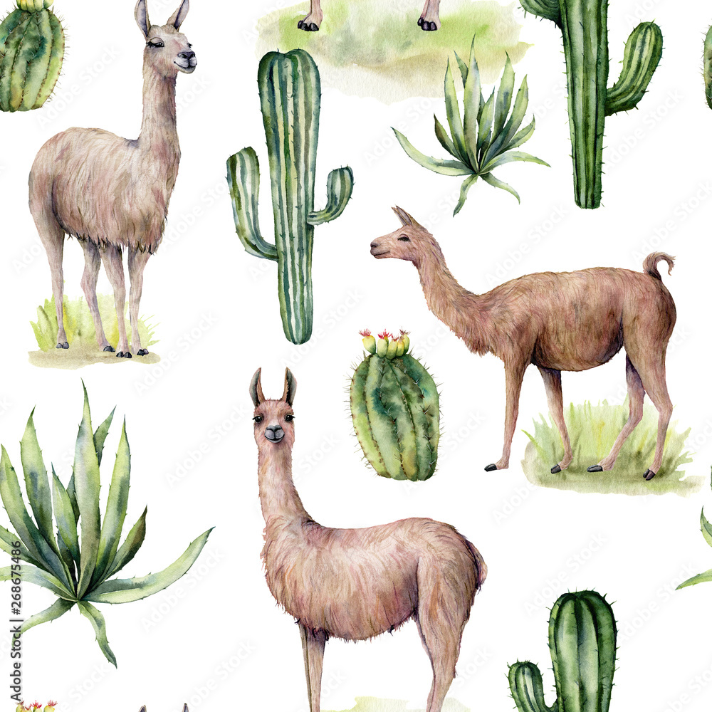 Fototapet Watercolor seamless pattern with llama and desert cacti