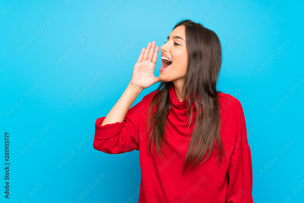 Fototapet Young woman with red sweater over isolated blue background shouting with mouth w