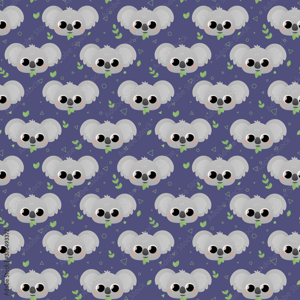 Fototapet Cute childish pattern with koalas and leaves and triangles, circles on dark blue