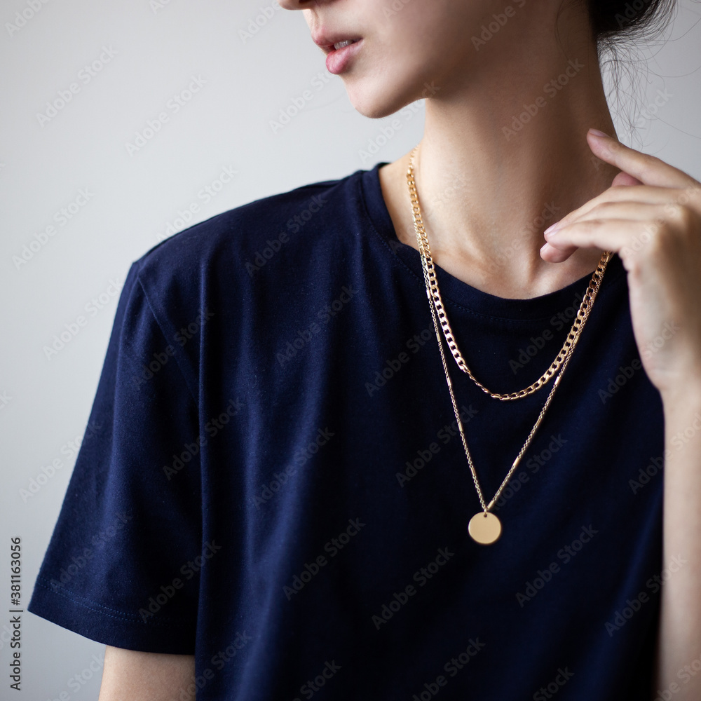 Fototapet Closeup photo of yping woman wearing dark t-shirt and golden necklace