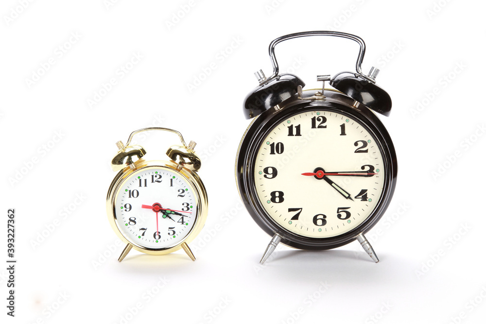 Fototapet Closeup shot of a two vintage alarm clock on a white background