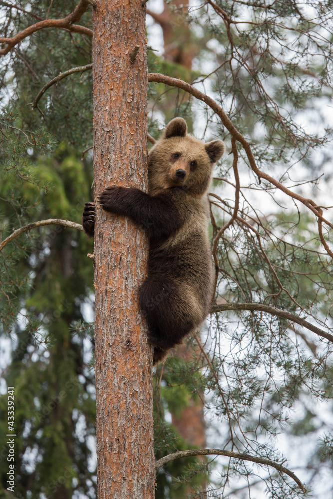 Fototapet Brown bear climbing tree in Tiaga forest