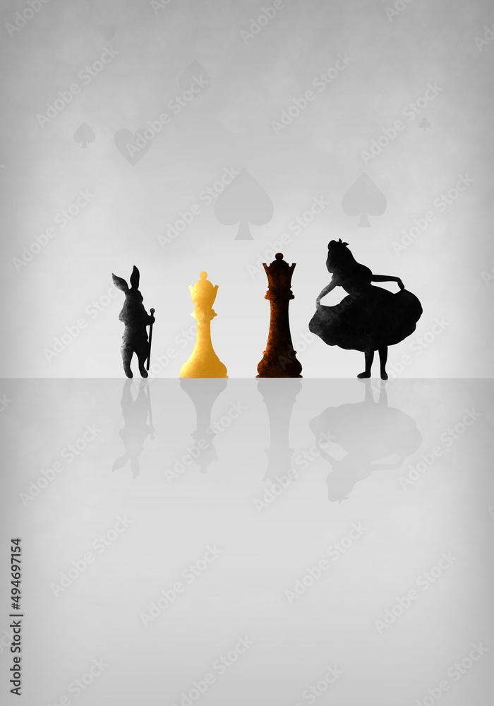 Fototapet Alice, the Rabbit and chess pieces Queen and King
