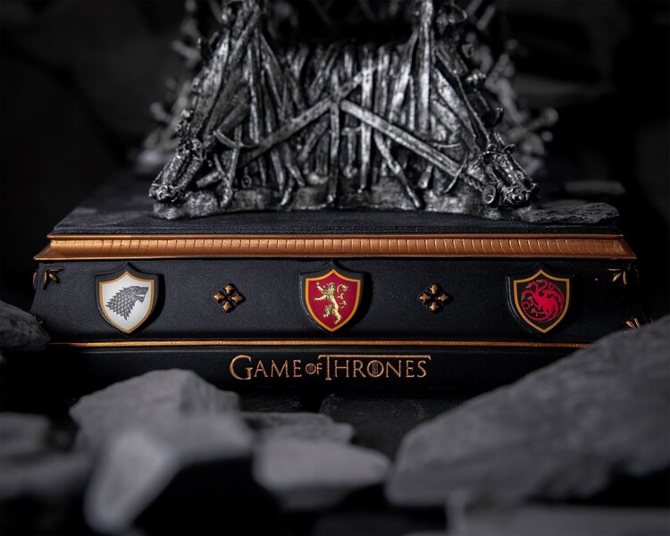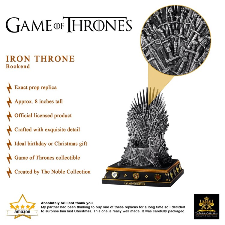 Detalii meticuloase ale unui tron legendarTronul de Fier este simbolul suprem al puterii și autorității - iar acum poate sta de pază peste poveștile tale preferate. Fabricat din rășină durabilă și pictat manual cu precizie, acest suport de carte captează fiecare detaliu al omologului său de pe ecran. Designul maiestuos este decorat cu emblemele caselor majore din Westeros, de la Starks la Lannisters.