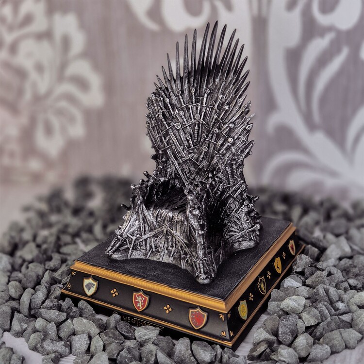Lasă-ți cărțile să se odihnească lângă însuși Tronul de Fier - simbolul puterii și al destinului în Westeros! Acest suport de carte pictat manual și lucrat complex aduce atmosfera epică din Game of Thrones direct pe raftul tău. Tronul iconic, făurit din săbiile războinicilor căzuți, este împodobit cu sigiliile marilor Case din cele Șapte Regate.