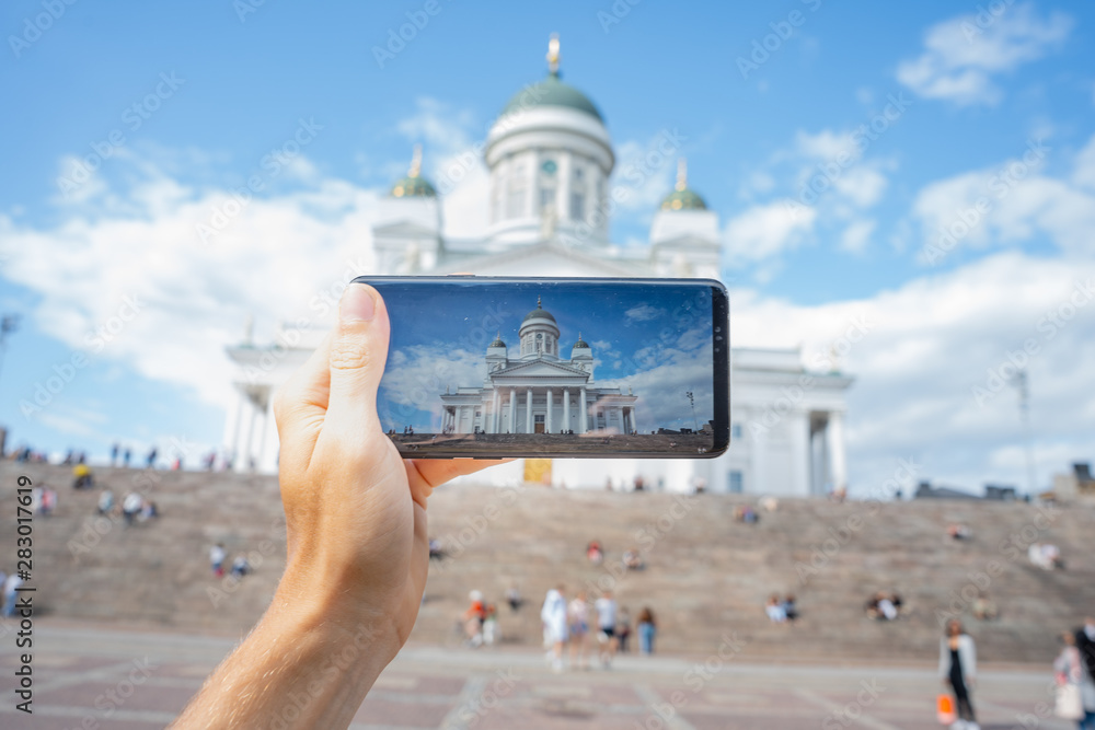 Fotografie HELSINKI, FINLAND - JULY 27, 2019: Smartphone photo of touristic view of Helsi