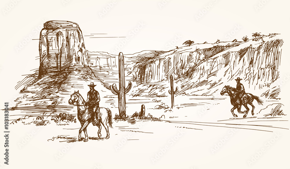 Fotografie American wild west desert with cowboys - hand drawn illustration