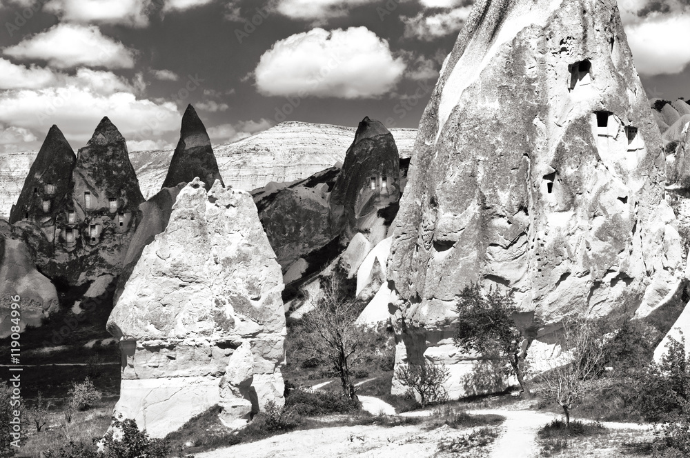 Fotografie Fantastic black and white landscape with cone-shaped rocks .