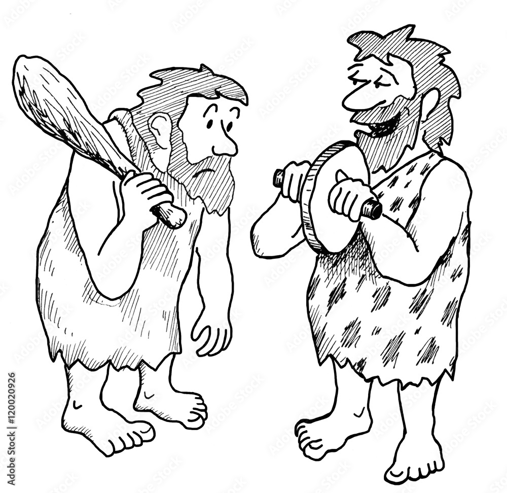 Fotografie Business illustration showing two cave men, one has invented the wheel