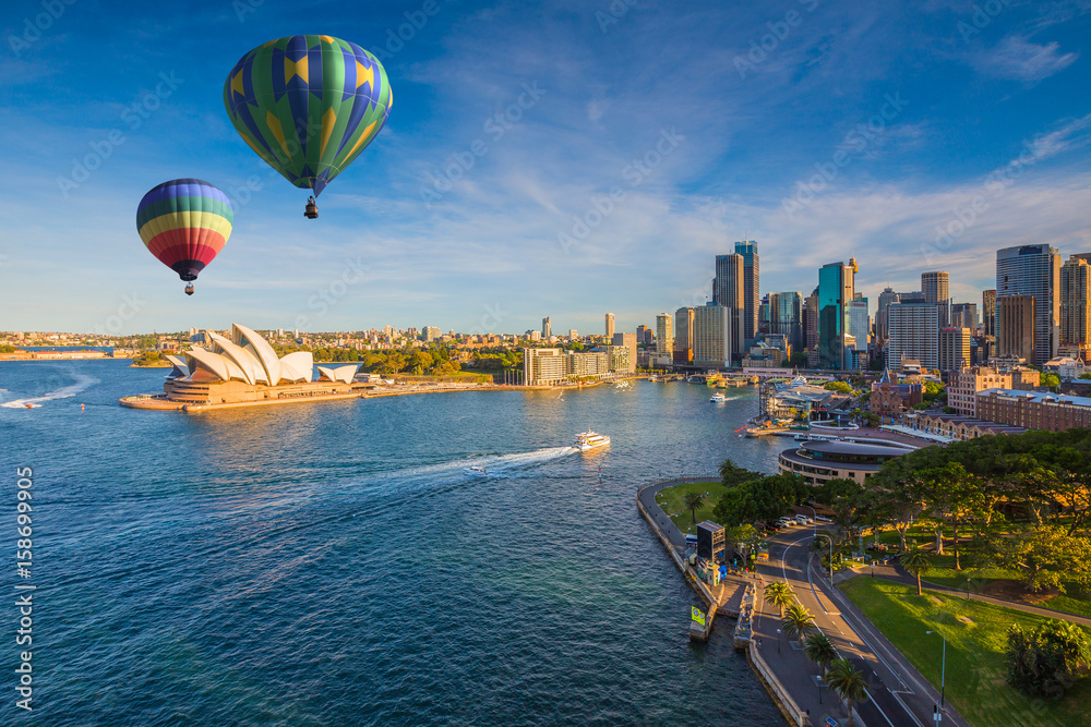 Fotografie Hot air balloon over Sydney bay in evening, Sydney, Australia