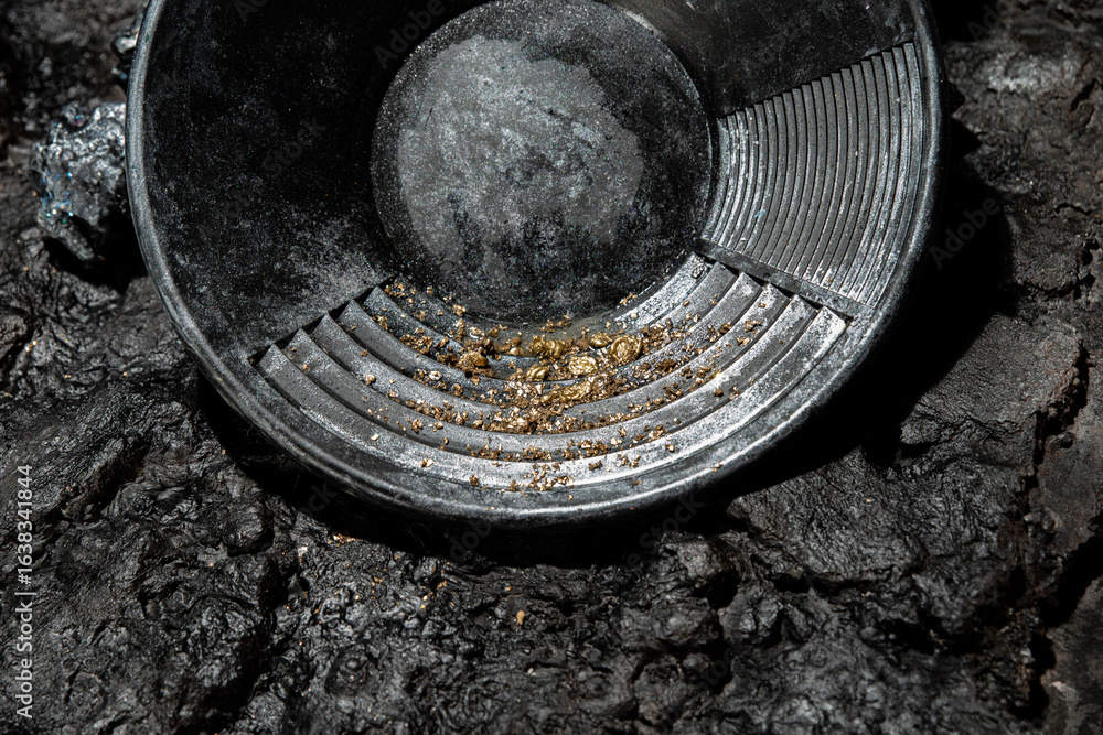 Fotografie Gold sand panning from placer deposit, small pieces of gold nuggets in the pan n