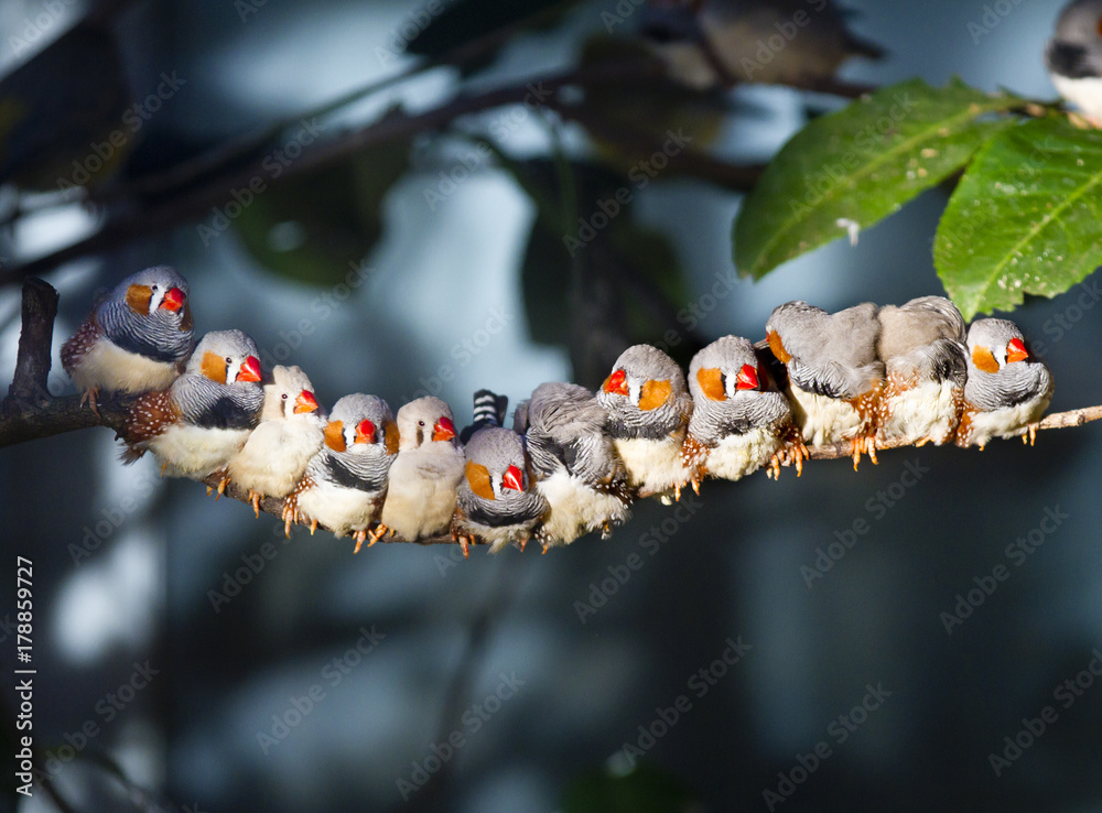 Fotografie Zebra Finch. Group of Zebra finches perching on a branch