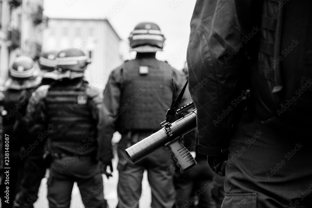 Fotografie French Police officers securing the zone in front of the yellow vests movement p