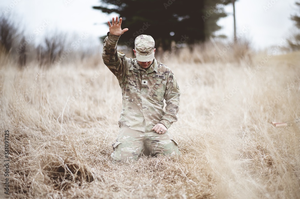 Fotografie American soldier kneeling in despair on a grass field with his hand raised above
