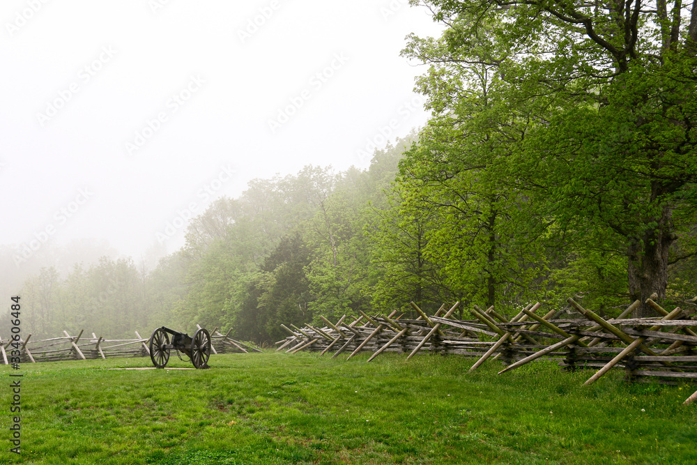 Fotografie Canon in field on foggy morning, Gettysburg, Pennsylvania.