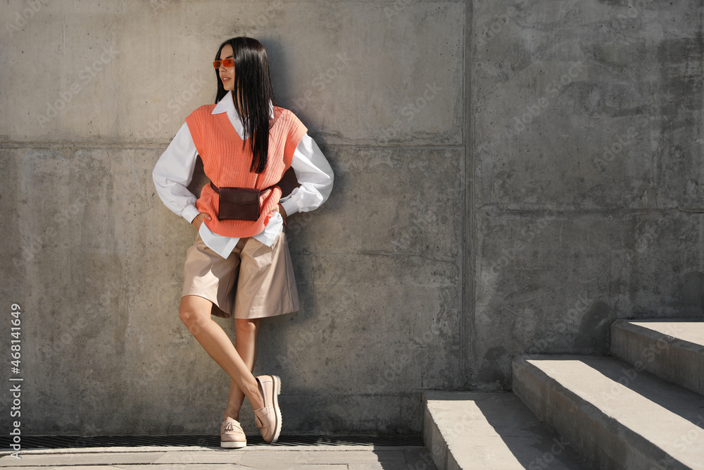 Fotografie Beautiful young woman with stylish waist bag near grey wall outdoors, space for