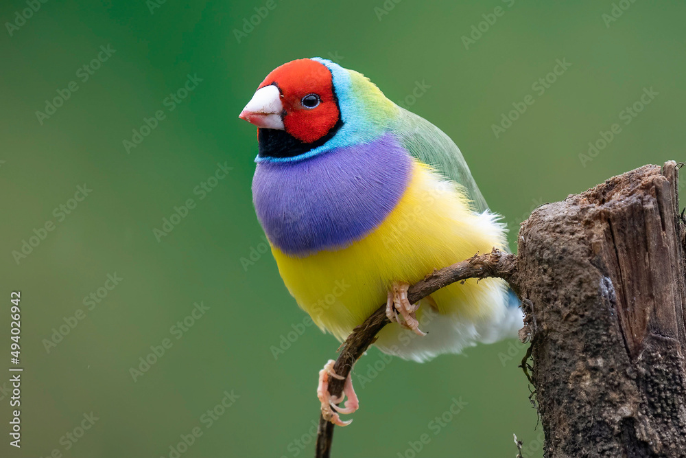 Fotografie Closeup of a colorful Gouldian finch (Chloebia gouldiae) standing on the narrow